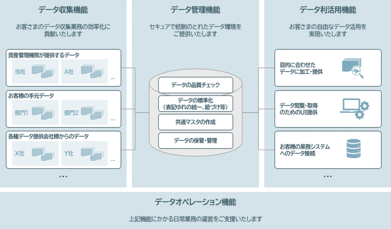 既存の資産管理サービスやそれに付随する情報提供に加え、顧客の資産運用業務に関わるデータを一元的に管理し、利活用できる基盤を提供することで、機関投資家および資産運用会社のニーズに応えるとしている。