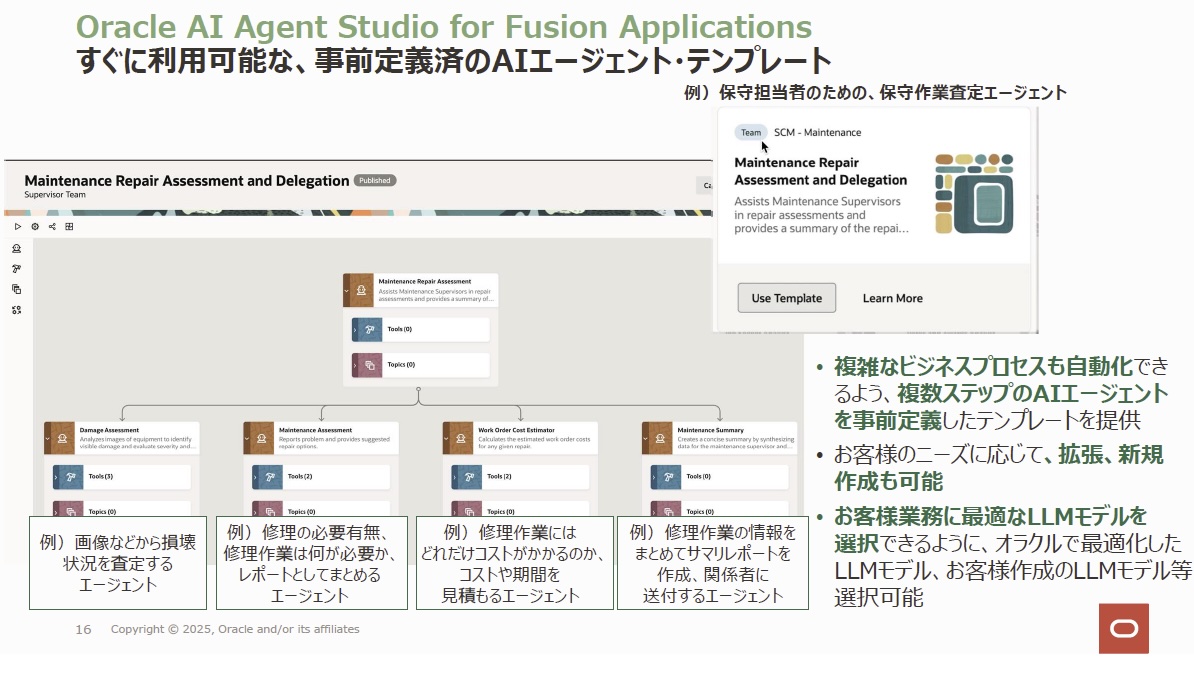 Oracleはさらに、自社の開発部門が使用してきた「AI Agent Studio」を顧客やパートナーにも提供することを発表した。このプラットフォームを通じて、プリビルドされたAIエージェントテンプレートの組み合わせや、カスタマイズが可能になる。
