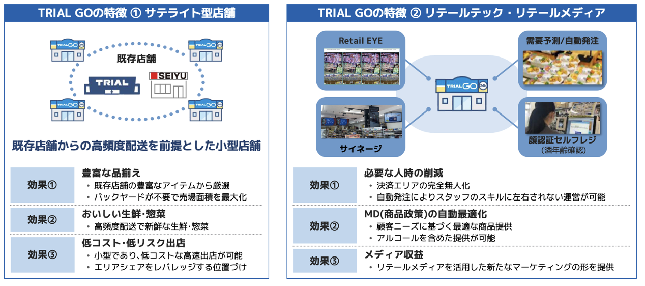 この構想を具現化するのが、西友店舗周辺への「トライアルGO」の出店という。トライアルGOは、顔認証決済などの最新技術で省人化を実現した小型店舗。これまで福岡県を中心に展開してきたが、首都圏でも年内に試験出店する方針だ。