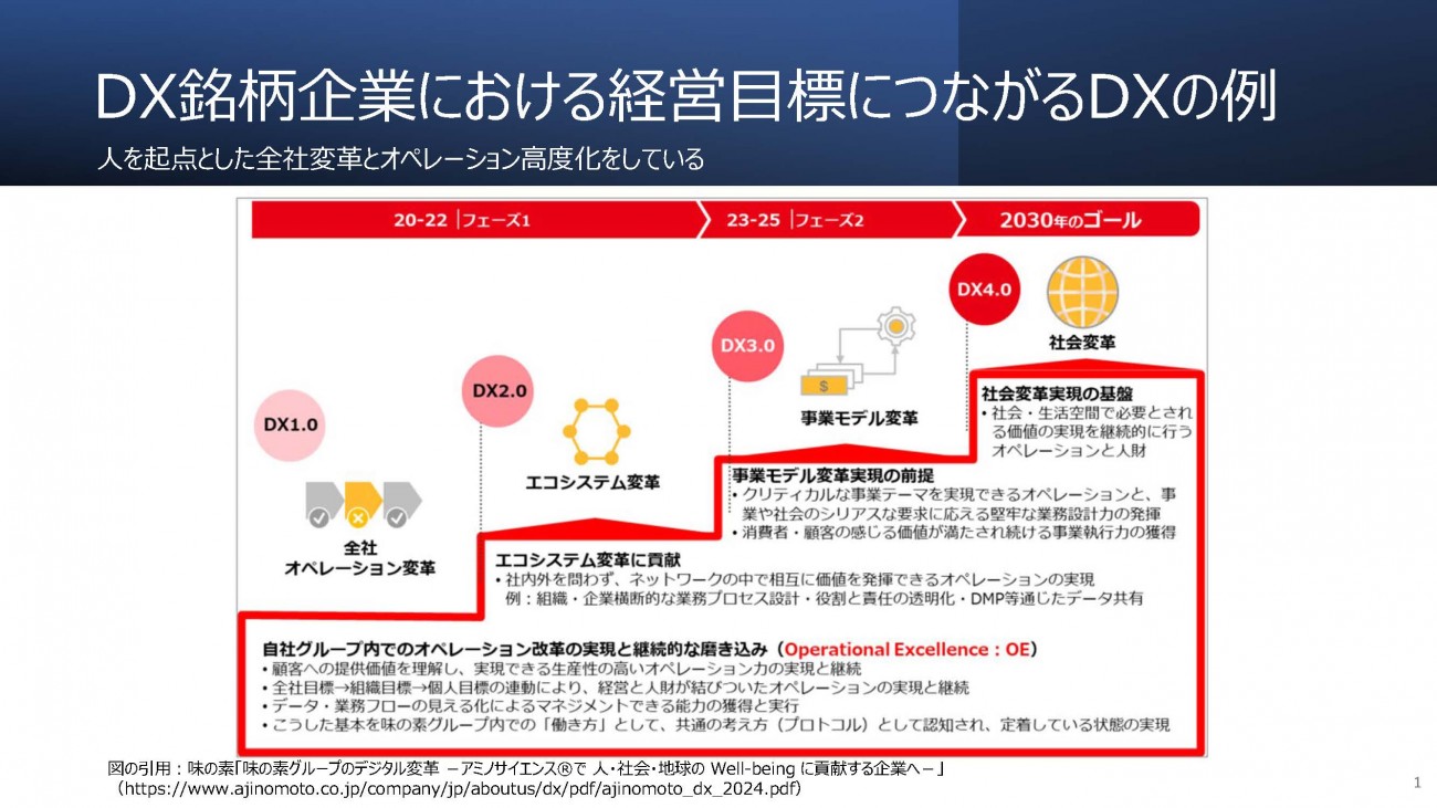 DXは単なるデジタル化ではない。経済産業省が情報処理推進機構(IPA)などと共同で行っている「DX銘柄」で評価された企業の事例を見ると、DXの本質は企業や組織の「価値観」や「行動様式」そのものを変革することにある。三角氏はまず、DX銘柄に認定されている味の素の取り組みを一例にあげながら詳細を解説した。