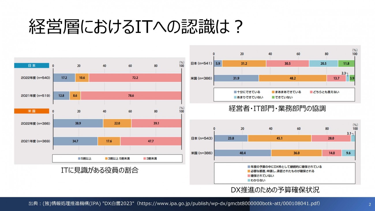 しかし、日本企業におけるDX推進は依然として課題を抱えている。日米比較のデータによれば、日本は米国に比べてIT関連の知識を持つ役員の割合が低く、経営者とIT部門、事業部門との連携も十分とは言えない。また、DX推進のための予算が単年度予算に依存している企業も多く、中長期的な視点での投資が不足している実態も示された。これは、DXが経営の中心課題として十分に認識されていないことの現れだろう。