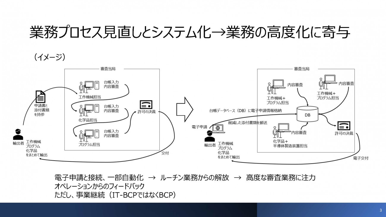 この課題に対し、同氏は単なる業務効率化に留まらない、組織文化そのものの変革に着手。まず、紙文化に慣れ親しみ「システム化なんてできない」と考える審査官の意識を変えることから始めた。「当時はDXという言葉もまだ浸透しておらず、私もこの取り組みをビジネスプロセス・リエンジニアリング(BPR)の文脈で捉えていた。申請者である企業が早く輸出できるように、そして行政官の負担を減らすためにも、審査の効率を上げる必要があった」と、当時の状況を振り返る。