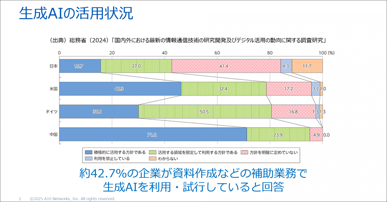 しかし、その便利さゆえに新たなリスクも生まれていることは皆さんもご存じだろう。A10ネットワークスの高木真吾氏は、生成AI活用の広がりにともない顕在化しつつあるセキュリティリスクの現状を指摘する。