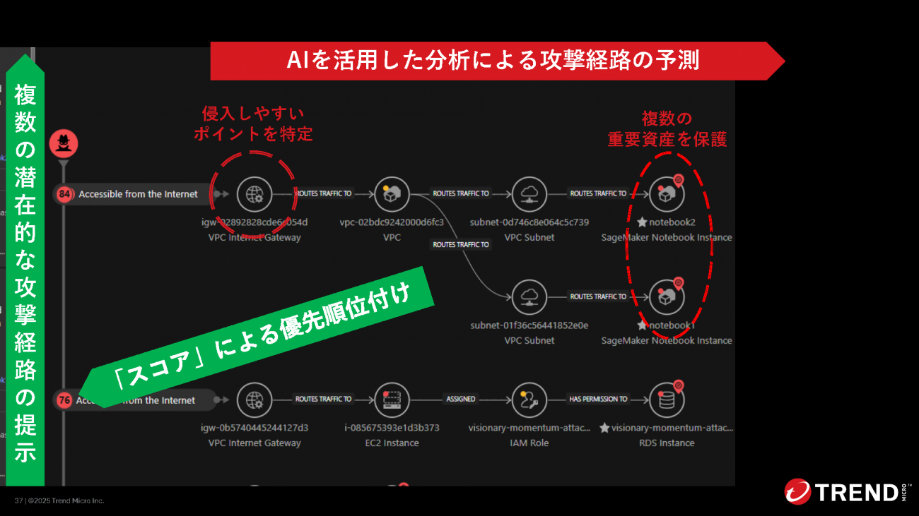 また、攻撃経路を予測する機能も提供している。組織内の個別リスクを相関分析により関連付け、攻撃者の視点から侵入口→権限昇格→横展開→最終標的までの攻撃経路をAIで可視化する。管理画面では、攻撃者にとって侵入しやすいポイントから最終標的までの、体系的な攻撃経路マップが表示される。複数経路が存在する場合もリスク値でスコアリングして優先順位を明示するため、効率的な対策判断が可能だ。