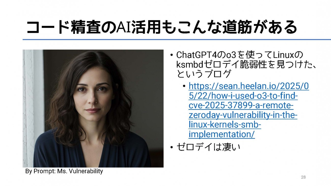 また、こうした育成の仕組みを考えるうえで、生成AIの進化も見逃せない。今年5月、英国のとある研究者が「OpenAI o3を使い、Linuxのksmbdゼロデイ脆弱性を見つけた」というブログを発表し、大きな話題を集めた[6]。これは、生成AIの能力が人間のコード監査能力に迫りつつあることを示す出来事であり、脆弱性探索の自動化が大きく進展する可能性を示唆している。