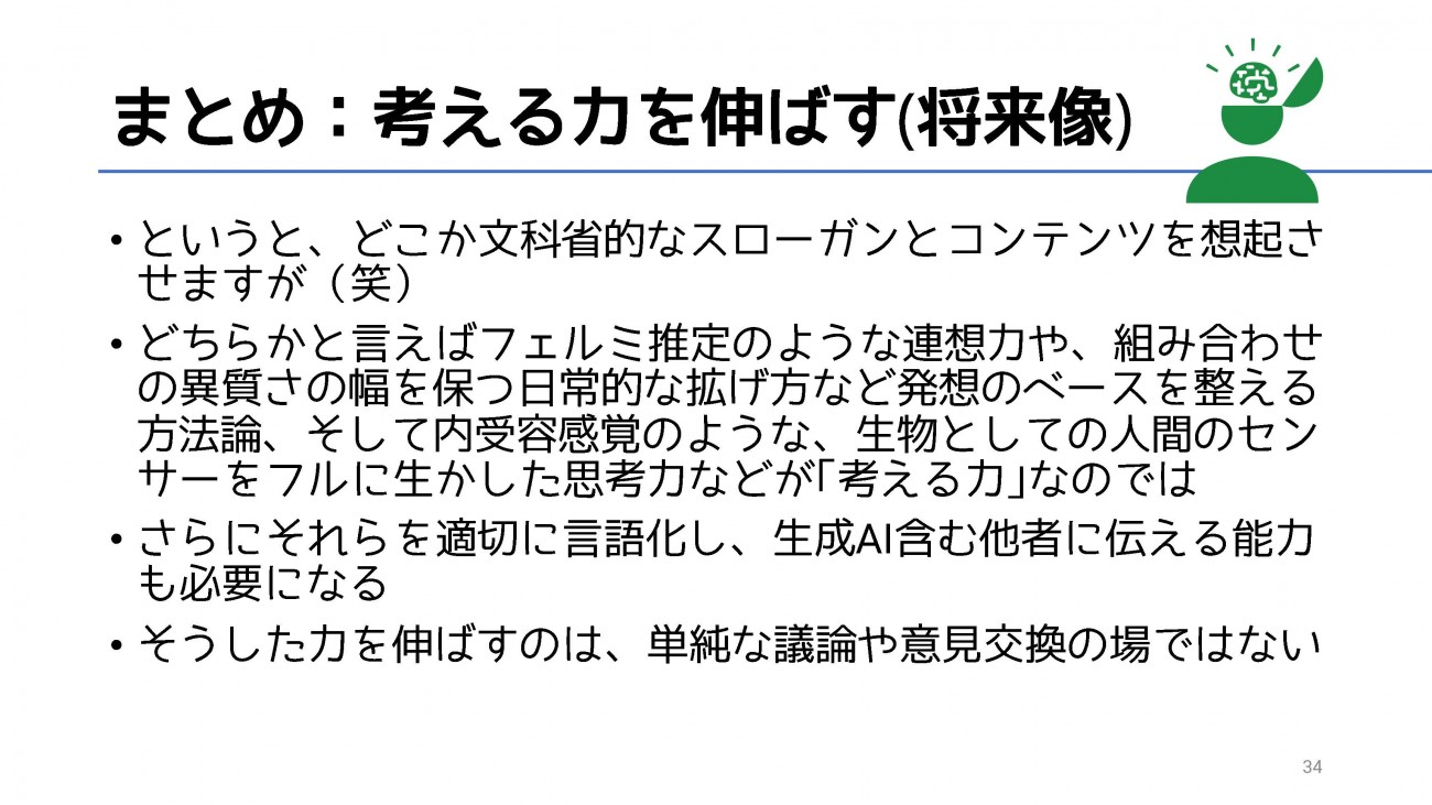 生成AI時代に求められる人材育成の核心は、「考える力をいかに伸ばすか」ということに集約される。園田氏がイメージする「考える力」とは、断片的な情報から全体像を類推するフェルミ推定のような連想力、まったく異なる分野の知識を組み合わせる発想力、内受容感覚など人間に備わるセンサーをフルに生かした思考力などを指す。また、それらによって得た考えを適切に言語化し、生成AIを含む他者に伝える力も不可欠となる。これらの力は、単純な議論や意見交換の場だけで養えるものではないだろう。