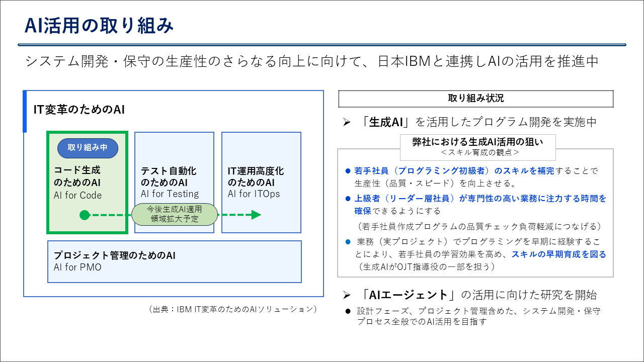 島田:開発生産性の向上は急務ということで、日本IBMと連携しながら進めています。まずはコード生成から徐々に始めて、着実に拡大しています。今後は、24時間365日の対応が求められる運用保守にもAIを活用していきたいです。夜中に障害が発生して叩き起こされる大変さはよく分かっています。社員がゆっくり寝られる時間を確保したいですね。
