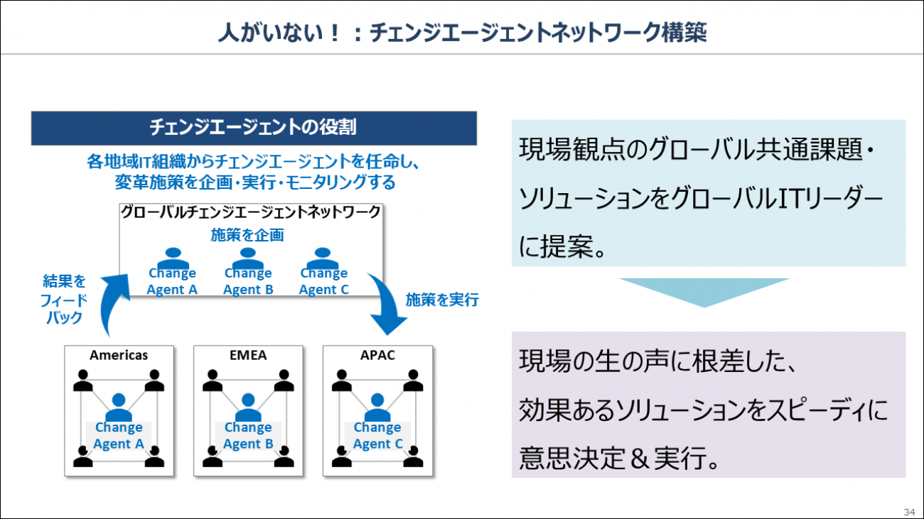 さらにグローバル全6地域からチェンジエージェントを任命し、グローバルなネットワークを構築。現場の課題を収集し、トップマネジメントに提案する仕組みを作った。コミュニケーションの壁には、Teamsの自動翻訳機能で対応。会議でのリアルタイム字幕翻訳も導入し、英語力だけに依存しないコミュニケーションを実現してきた。