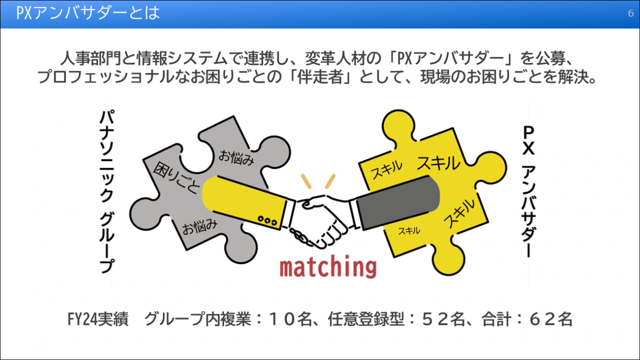 中でも注目すべきは、PXアンバサダーだ。現場のプロフェッショナルをアンバサダーとして公募し、お困りごとがある部門とマッチングさせる仕組みで、2024年度は62人が活動し、9ヵ月で170件の依頼に対応。5点満点中4.72という高い満足度を獲得した。今年度は既に150件を超える依頼があり、累計320件のお困りごとを解決しているという。