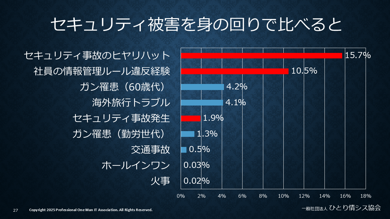 セキュリティ事故の発生確率は1.9%で、98.1%の企業は現時点で被害に遭っていない。この数字を見て「うちは大丈夫」と考える経営者は少なくないだろう。しかし実際には、交通事故の発生率0.5%や、がん罹患率(勤労世代)1.3%より高い。また「セキュリティ事故のヒヤリハット」は15.7%が経験している。