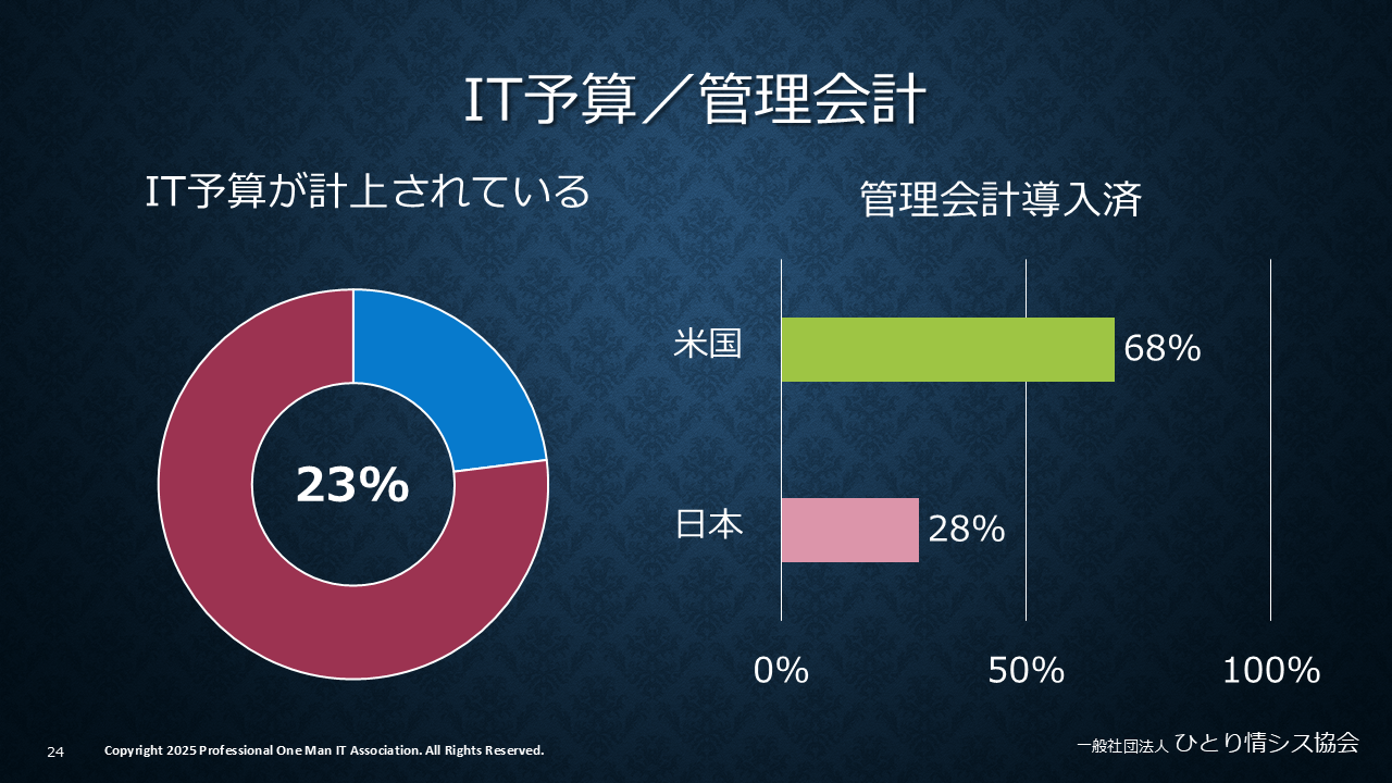 なぜ日本企業はセキュリティに投資できないのか。清水氏によると、中小企業でIT予算を事前に決めている会社は23%しかない。残りの77%は都度決裁で、その時々の業績で投資を決める大福帳管理だ。
