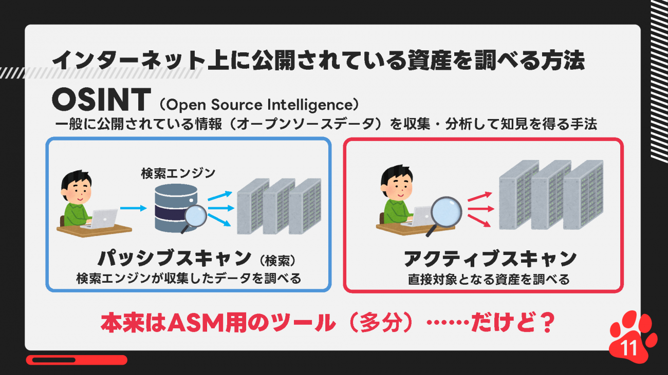 OSINTは、公開情報を分析して対象に関する知見を得る技術全般を指す。調査のための偵察(スキャン)の手法は大きく2つに分けられる。1つは、検索エンジンなどを使って情報を集めるパッシブスキャン。もう1つは、ポートスキャンなどのコマンドやツールを使って対象となる資産を直接調べるアクティブスキャンだ。防御側が使えば、自社の情報露出状況を把握する手立てとなるが、攻撃者が使えば侵害の糸口を見つける手段となる。実際、攻撃プロセスの8~9割はこうした情報収集に費やされると野溝氏は指摘する。