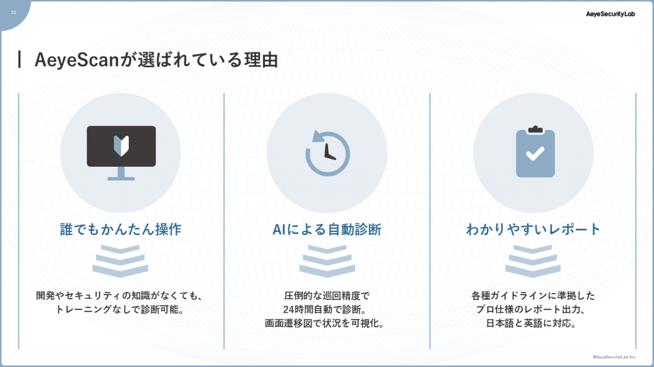 「セキュリティの専門家ではない社内メンバーでも、使いこなせる」かつ「本格的な機能と品質を備えている」という条件のもと、様々な製品を比較検討した結果、AeyeScanが選定されたという。阿部氏は「外部のセキュリティベンダーに診断を依頼した際の結果とほぼ同等の精度を達成した、唯一の製品だったと評価いただいています」と述べる。