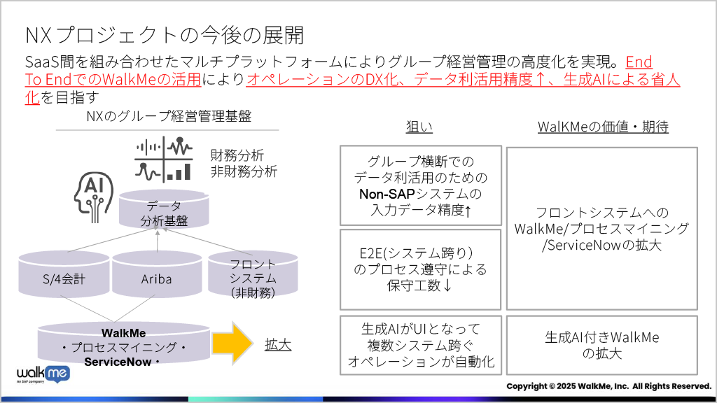 今後、NIPPON EXPRESSは、SaaSを組み合わせたマルチプラットフォーム戦略により、グループ経営管理基盤のさらなる高度化を目指す。WalkMeの活用範囲を広げながらオペレーションのDX、データ利活用の精度向上、そして生成AIを活用した省人化を実現していく計画だ。