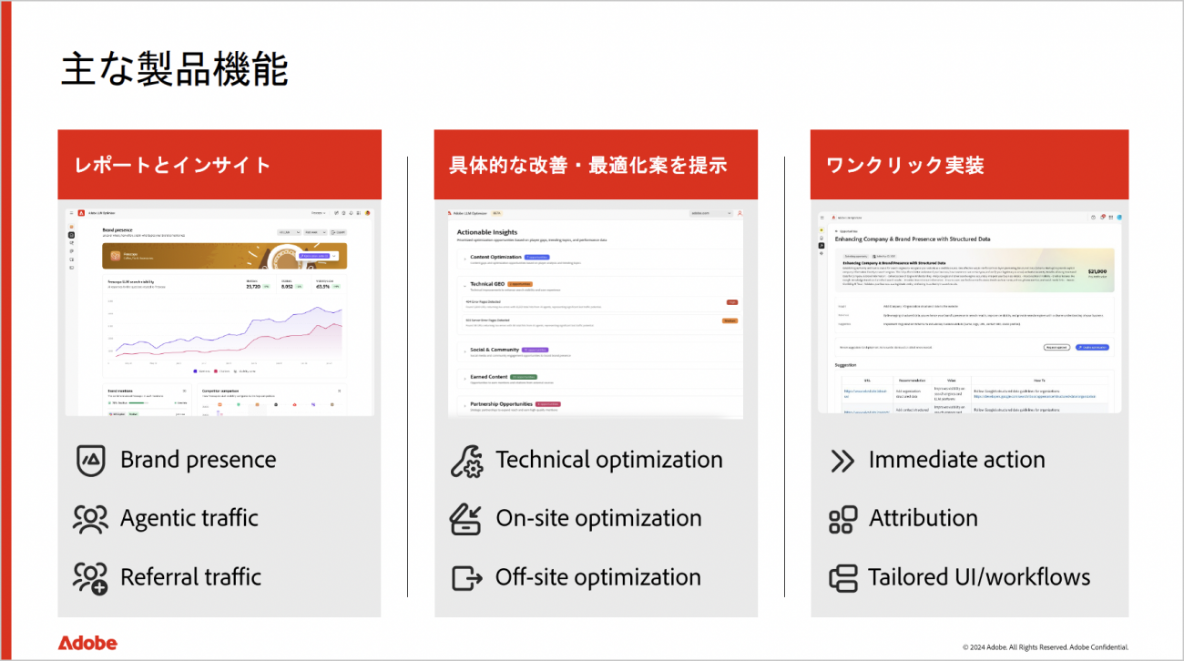GEOの目的は、データからインサイトを得て、自社Webサイトを人間にもAIにも影響力の高いものに最適化し、収益を生み出すことだ。Adobe LLM Optimizerでは、大きく「レポーティング」「コンテンツの最適化提案」「提案の実装」という3つの機能を提供する。