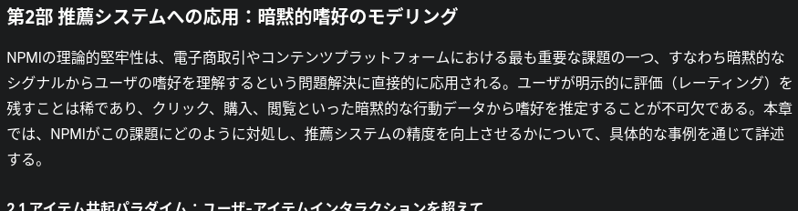 このプロンプトでDeep Researchを実行すると、NPMIの理論的解説から社会実装された具体的な事例まで、引用元のついたレポートをまとめてくれます。