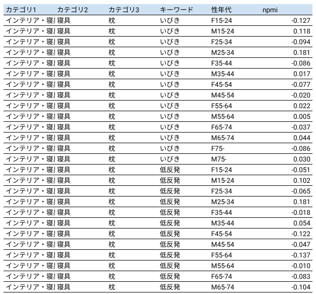 図2:データ例(キーワードと性年代のかけ合わせでNPMIを計算した結果一覧)