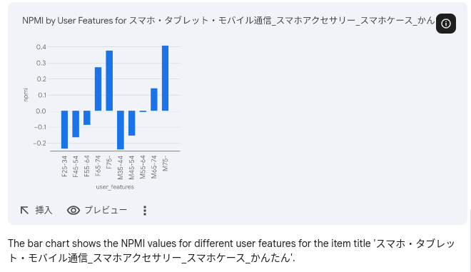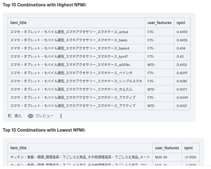 自分一人では丸一日かかっても終わらないようなレベルのレポートが数分で作成されるのです。後は気になる部分を読み込んでいくことで、手法の特徴や注意すべき点、利活用事例を押さえることができます。ここで得られた事前知識を元に、改めて今回の分析設計を進めました。今回は、ある性年代のユーザーがある単語を商品名に含む商品を購買した数をもとにNPMIを計算し、関連性を評価することにします。こうすることで、NPMIが1に近い単語ほどその性年代が購買しやすいキーワードという解釈ができるようになります。