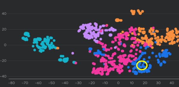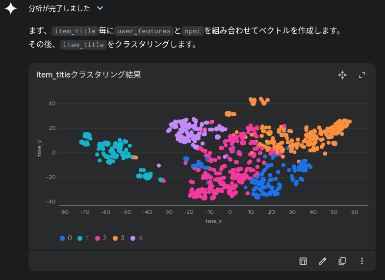 たった2文の自然言語の指示でキーワードクラスタができました。実行されたソースコードも確認できるので、このグラフが何を表しているかも明瞭です(k-meansでクラスタリングしたものをt-SNEで二次元平面に次元圧縮して可視化していました)。各点がキーワードに対応しており、先ほど見ていたNPMIの性年代グラフが似ているものが近くにプロットされている状態、ということになります。