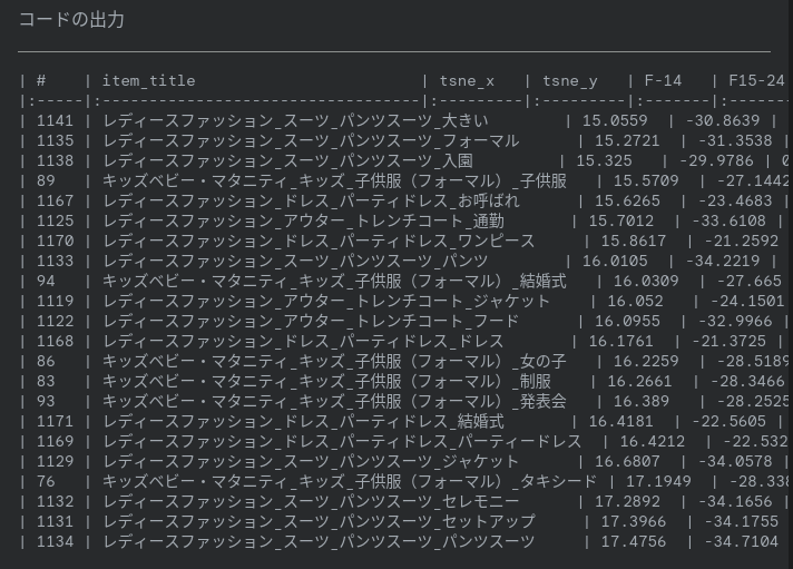 クラスタ分析の結果から「(レディースファッションの)パーティードレス」と「(子供服の)フォーマル」が類似する購買層(性年代)を持つキーワードとして抽出されているのは興味深いですね。これは「特定性年代の購買者は、イベント用に子供の服と自分の服を一緒に揃えたりするのかもしれない」といった、より深いユーザー行動の仮説立案につながります。ここまでわかってくると、「性年代別に購買につながりやすいキーワードを選定してメルマガ配信してみる」という施策につながっていきそうです。
