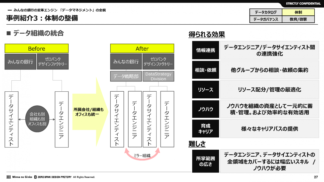 データマネジメントの一環として、体制の変更も行った。同社では銀行業務を担うみんなの銀行とシステム開発を手がけるゼロバンク・デザインファクトリーの2社体制を採用していたが、2025年からデータ組織を統合している。「データサイエンティスト(ビジネス側)とデータエンジニア(開発側)の業務の境目がどこにあるかは会社によって違うと思いますが、我々の中でもそこが曖昧で、『この相談事はエンジニアに聞くべきかサイエンティストに聞くべきかがわからない』といった状況がありました」と本嶋氏は統合の背景を説明する。