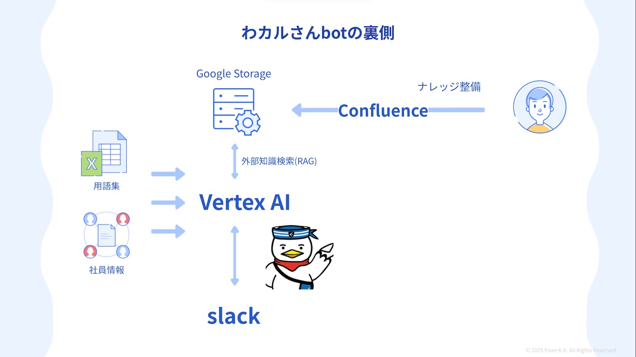 この状況を打破すべく、同社は2023年5月にアトラシアンのプロジェクト管理製品である「Jira Service Management」を活用し、対応するためのQ&Aを同社のドキュメント管理ツール「Confluence」に蓄積し、それまでGoogleドライブに点在していたマニュアルや規程類を、検索可能な形で整理し始めた。そして同時期に検討が始まったのが、AIチャットボット「わカルさんbot」の開発だった。