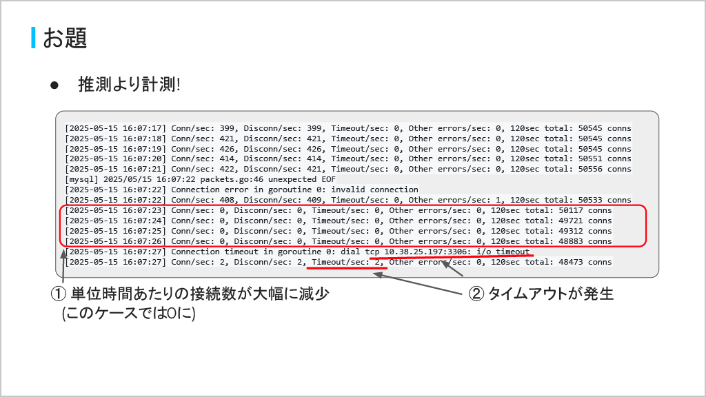 TiDBノード5台のうち1台を非Gracefulなシャットダウンでメンテナンスした場合、単位時間あたりの接続数が大幅に減少し、接続がタイムアウトすることを確認。この影響を分析した結果、通常の処理時間が平均3ミリ秒、接続タイムアウトが3秒というシナリオでは、5台のサーバーのうち1台にタイムアウトを発生させたとき、(ロードバランサーがラウンドロビンだった場合)1/5の確率で1,000倍の処理時間を占有し、結果的にスループットが1/200に落ち込む可能性があると前田氏は説明する。この問題は、特に新規接続時のコネクションタイムアウトによって引き起こされ、影響が大きいため対応が必須だったという。