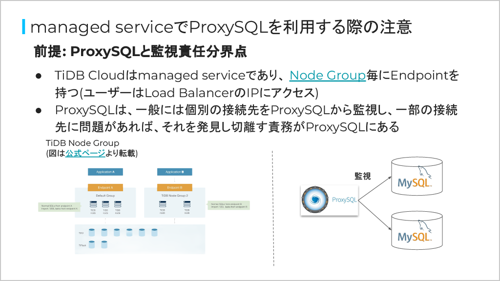ただし、マネージドサービスであるTiDB CloudでProxySQLを導入する際には注意が必要だ。TiDB Cloudでは、ユーザーはノードグループのエンドポイントにアクセスするが、一般的にProxySQLには個別の接続先に問題があれば、それを切り離す機能が求められる。そのため、バックエンドの切り離し・隔離に配慮した設定が必要だ。たとえば、許容する失敗回数を示す「`shun_on_failures`」や、隔離期間を示す「`shun_recovery_time_sec`」といったパラメータの設定が欠かせない。