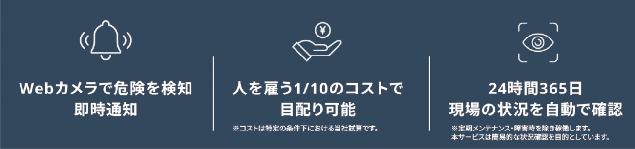 - 進入検知:立入禁止エリアへの侵入を検知し、管理者への即時通知から迅速な対応へとつなげる