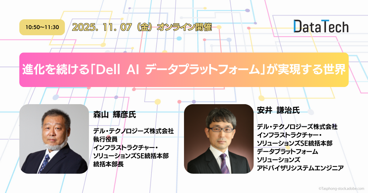 - 登壇者:デル・テクノロジーズ株式会社 執行役員 インフラストラクチャー・ソリューションズSE統括本部 統括本部長 森山輝彦氏/デル・テクノロジーズ株式会社 インフラストラクチャー・ソリューションズSE統括本部 データプラットフォーム ソリューションズ アドバイザリシステムエンジニア 安井謙治氏