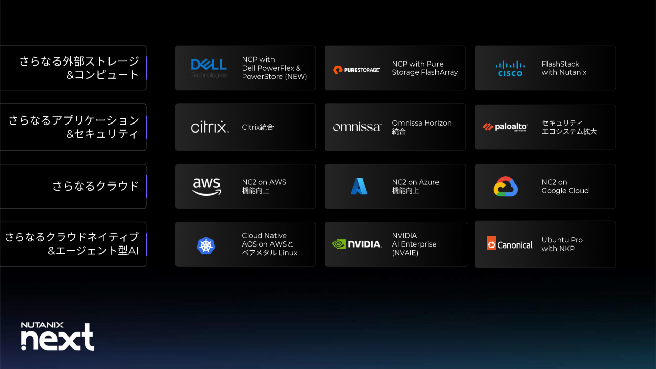 - コスト管理と回復力のあるインフラストラクチャの確保:市場における価格の加速、バンドル、パートナーや顧客へのサポート縮小といった最近の他ベンダーの動きから、Nutanixは顧客にとっての「安全な避難場所」として見なされている