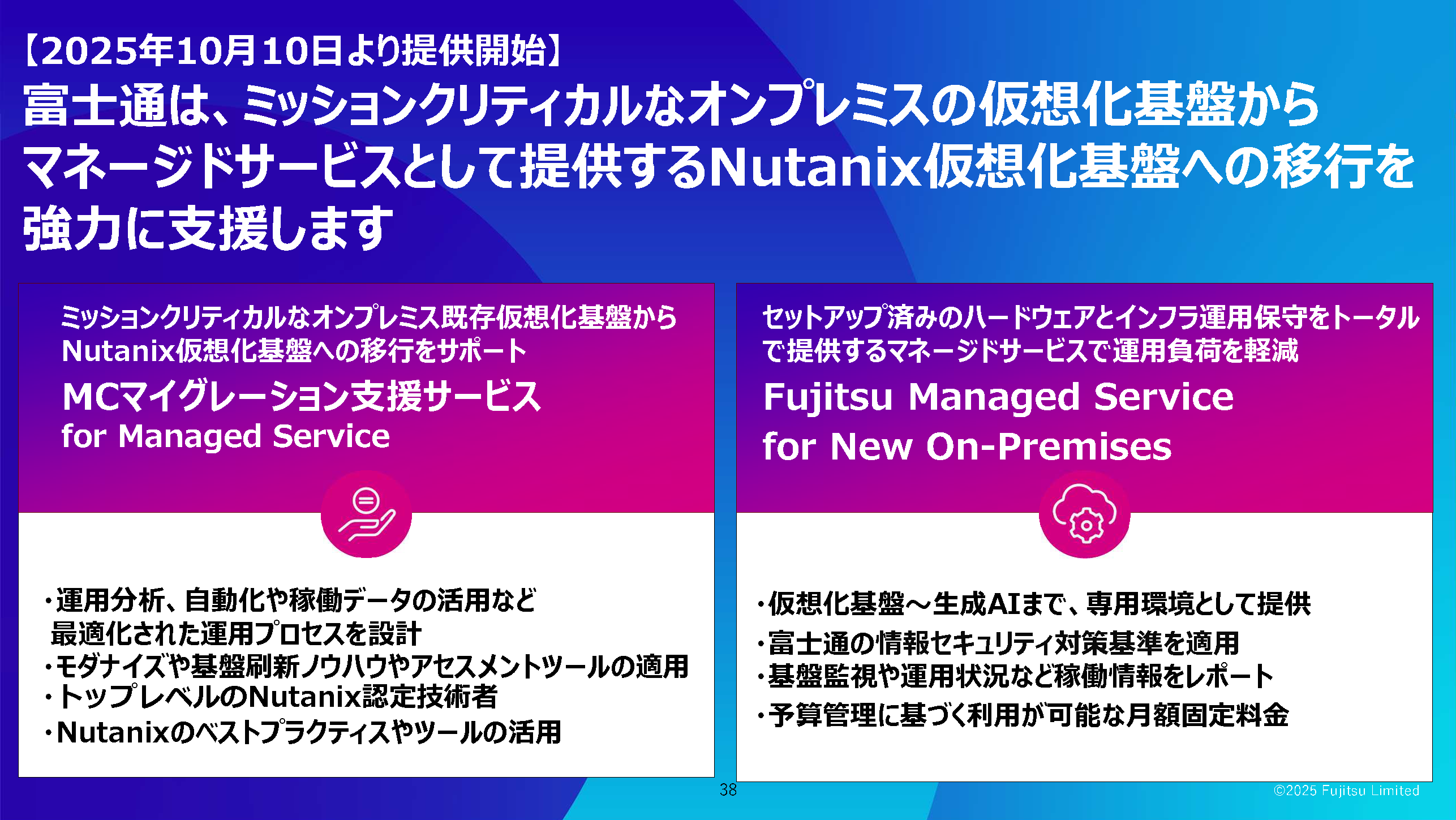 この社内実践に基づき、富士通は2つの新たなサービスを発表。一つは、既存仮想化環境からNutanix環境への移行を支援するプロフェッショナルサービスである「MCマイグレーション支援サービス for Managed Service」だ。これには、Nutanix Moveの活用、Nutanixのベストプラクティスと富士通の実践知に基づく最適なハードウェア構成の提案、そして運用設計の支援などが含まれる。関根氏は、同サービスの提供に向け、Nutanixの認定技術者を前年比10倍に増強したと話す。