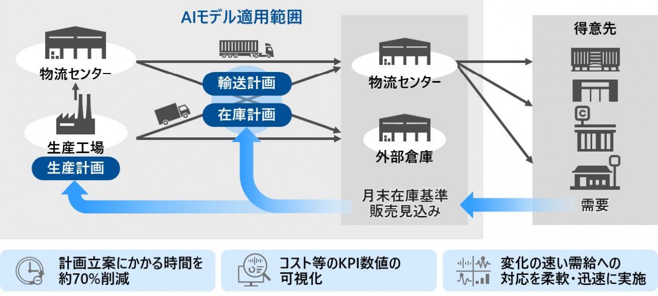 また、詳細な内訳や分析が困難であったコストなどのKPIを可視化。加えて、システムへの入力データを見直すだけで計画修正ができるため、変化の速い需給にもより柔軟かつ迅速に対応するとしている。これにより、計画立案業務の簡素化や脱属人化、および人が見落としがちな制約や相互依存関係を考慮した最適なサプライチェーン計画の立案が可能となり、計画の質の改善にも貢献するという。