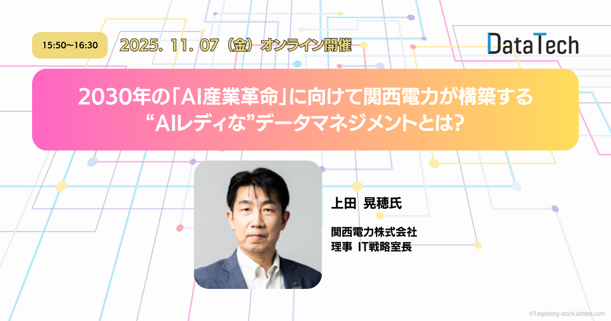 15:50から始まるクロージング講演には、関西電力 理事 IT戦略室長 上田晃穂氏が登壇。本講演では、2030年に到来が予測される「AI産業革命」を見据え、関西電力がどのように“AIレディな”データマネジメント体制を構築しているかを紹介します。