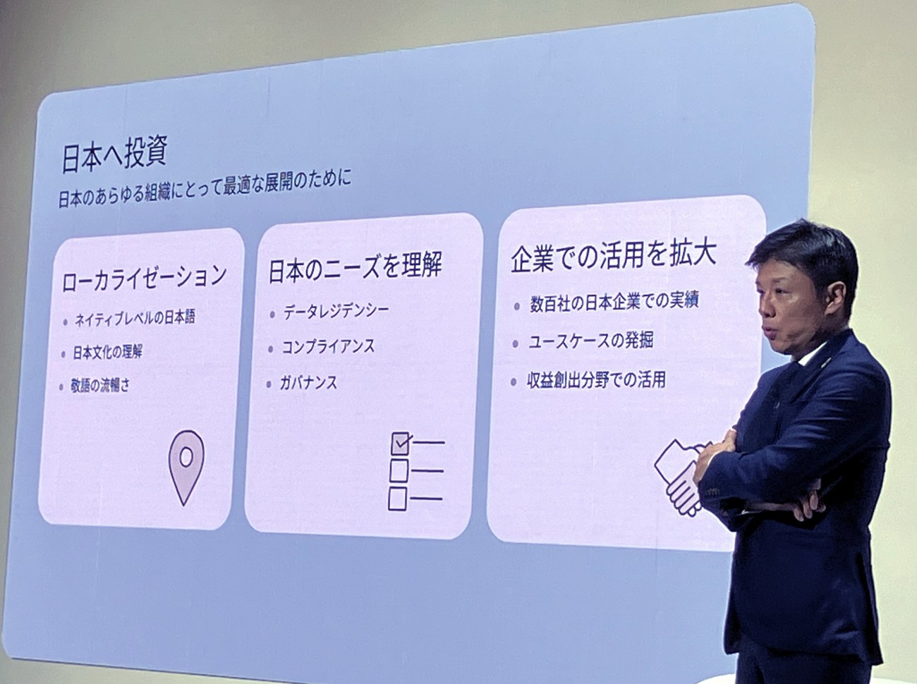 また、日本市場では「ローカライゼーション」「日本のニーズを理解すること」「企業での活用拡大」を柱として投資を行うとする。具体的には、(流暢な敬語など)ネイティブ水準の日本語能力、データレジデンシーやガバナンスの担保、そして日本企業での実績を積みながら新たなユースケースの発掘を進めていくとのことだ。
