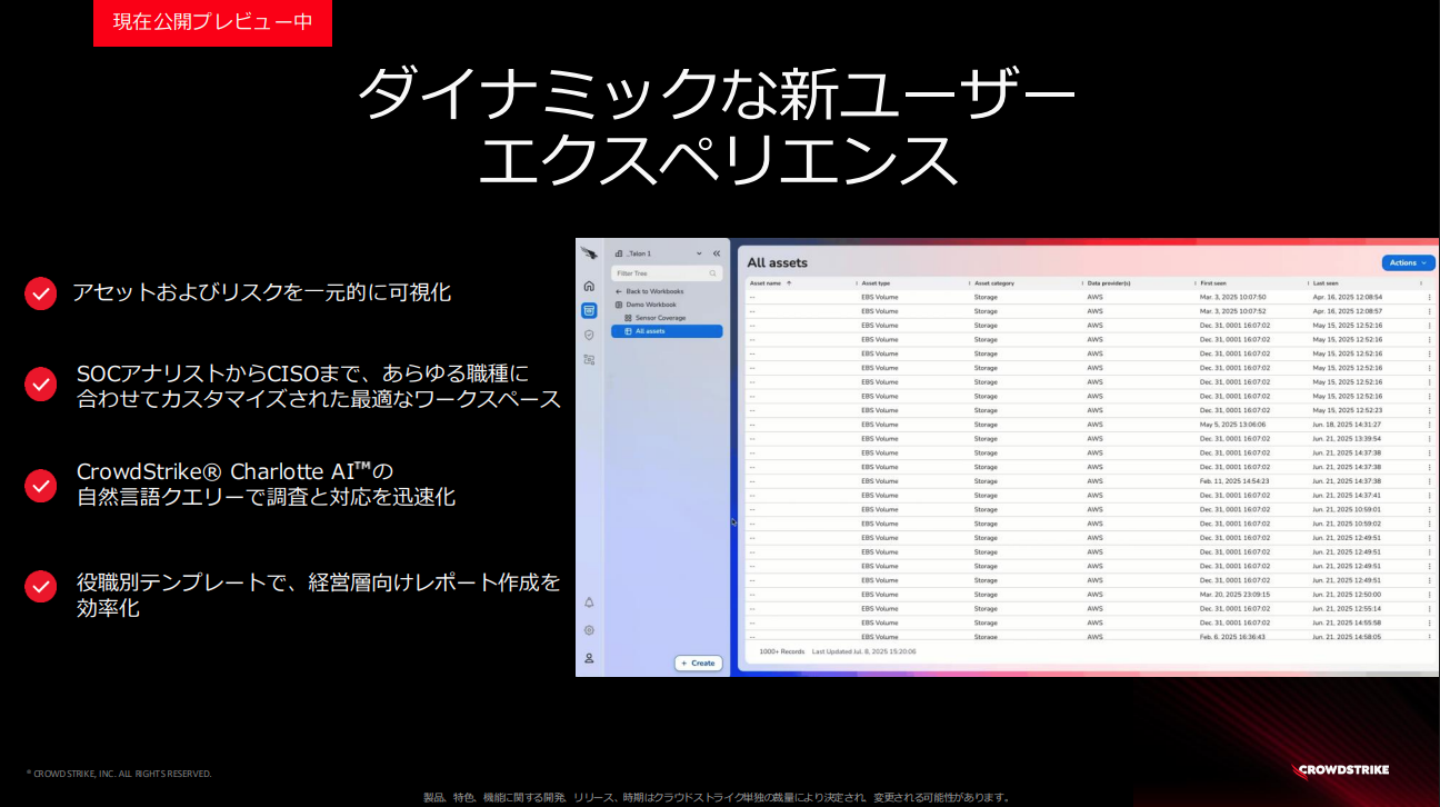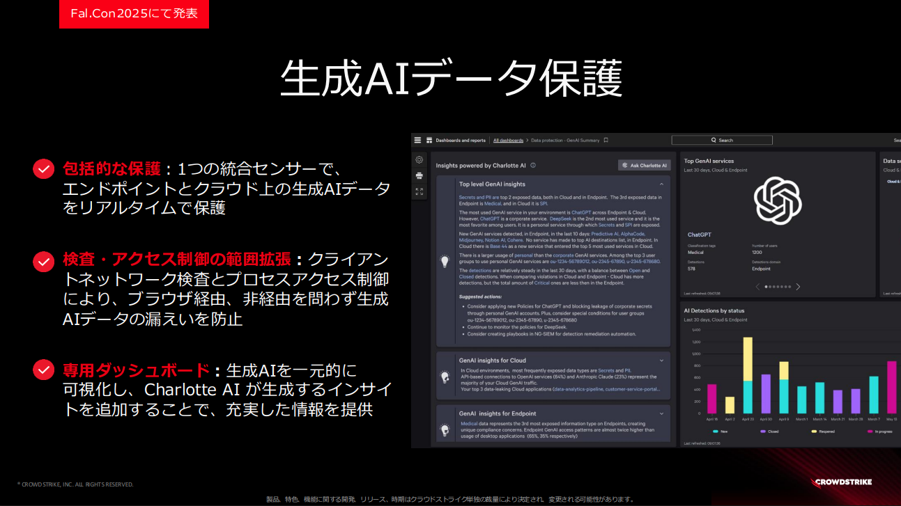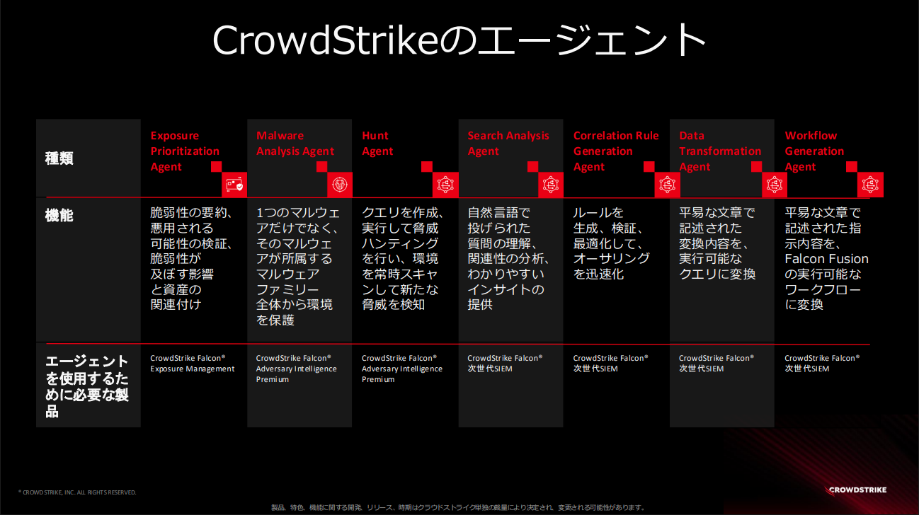 「Crowdstrike FalConプラットフォーム(以下、FalConプラットフォーム)」を、AIおよびAIエージェント機能を活用できる“AIレディ”なセキュリティ基盤にアップデート。具体的には、以下4点が大きなポイントだという。