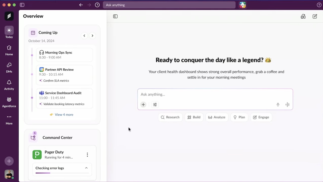 新しいSlackの画面には「Today」ビューができた。自身のカレンダーと連携しているので、1日の始まりにSlackを起動すると、何をするべきかがわかる。また、「Agentforce」ビューに切り替えると、自分の業務をサポートしてくれるAIエージェント群も確認できる。その役割は設定で拡張でき、質問に回答してくれるAIエージェントもいれば、プロアクティブに動いて業務をサポートしてくれるAIエージェントもいる。24時間365日対応のAIエージェント群をうまく活用することで、自分の業務の成果をスケールできる。