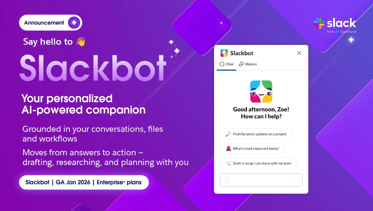 Slackbotは、会話の文脈の中でユーザーの思考と行動をともにしてくれるAIアシスタントへと進化した。今後に向けては、ノーコードでのアクションの自動的な実行、新しいAIエージェントの構築も可能にする計画が進行中である。新Slackbotの一般提供開始は2026年1月を予定している。