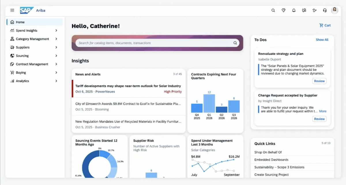 新たなAriba Launchpadでは、AIが業務のナビゲーション、やるべきことリスト、アクションにつながるインサイトを提供してくれる。たとえば、エネルギー調達担当のカテゴリーマネージャー(以下、担当者)が、ソーラーパネルの追加購入を検討していたとしよう。するとAIが、「新たな関税措置がソーラーパネルの価格に影響を与えている」というアラートを表示する。このアラートはAriba Category ManagementからAriba Launchpadに届いたもので、ユーザーはリンクをクリックすれば情報ソースの詳細を確認できる。
