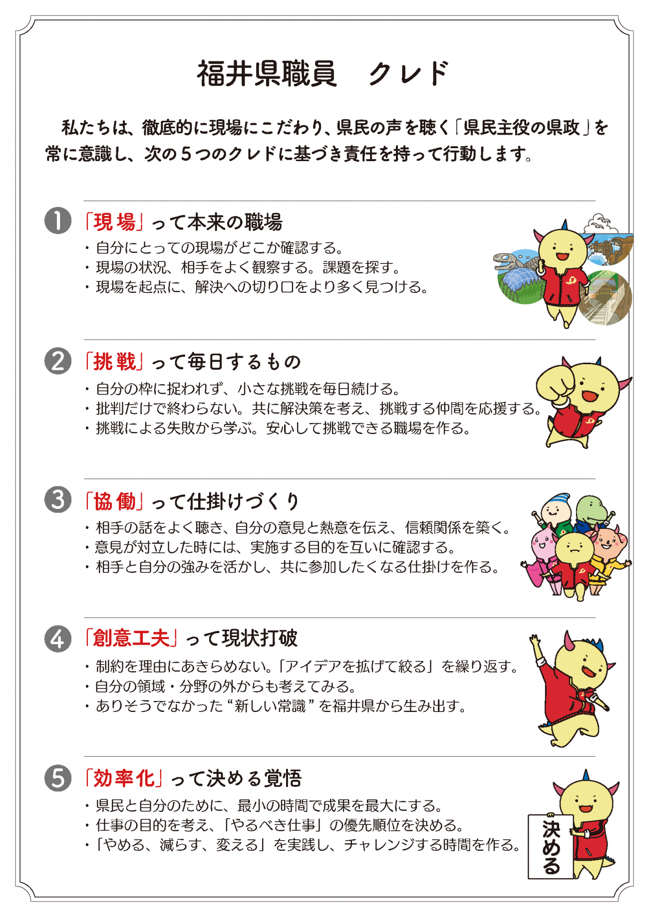 さらに、福井県では「クレド」と呼ばれる行動指針が記載された小さなカードを全職員に配布して、意識改革を図っている。桑野氏は「クレドはいつも持ち歩いています」と首から下げた職員証のケースから素早く取り出して見せてくれ、筆者は思わず「さすがですね」と感嘆の声を上げた。クレドには、次の5つが記載されている。