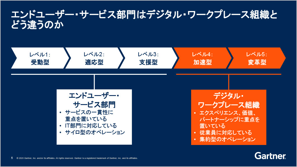 デジタルワークプレイスは、ヘルプデスクなどのITサポートに代表されるエンドユーザー向けサービスが進化した姿であり、成熟度モデル(下図)で表せるという。たとえば、従来的なエンドユーザー向けサービスは、トランザクションベースの“受動的”なものであり、サイロ型のオペレーションが特徴的だ。ガートナーが提示する成熟度モデルでは、「レベル1(受動型)」と「レベル2(適応型)」に相当する。