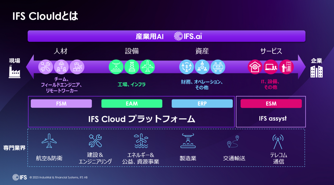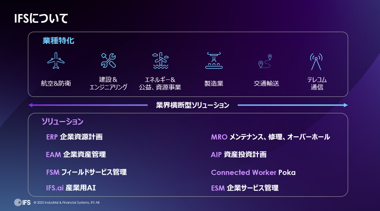 1983年にスウェーデンで創業されたIFS。産業特化型のERP、EAM(企業資産管理)、FSM(フィールドサービス管理)ソリューションを提供する企業だ。現在はグローバルで7,000名以上の従業員を抱え、2024年の収益は約2000億円にのぼる。航空・防衛宇宙、製造、建設・エンジニアリング、エネルギー、交通輸送、テレコム・通信といった、特定のミッションクリティカルな業界に特化したソリューションを展開している点が特徴だ。日本法人(IFSジャパン)は1997年に設立され、今年で28年目を迎える。