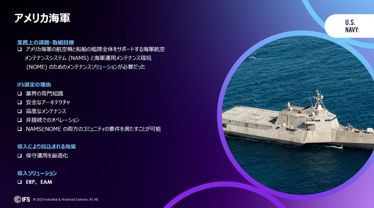 同社の主要なユーザーとして挙げられるのが、たとえば米国海軍(United States Navy)だ。米国海軍では、船舶の艦隊全体と航空機をサポートする海軍運用メンテナンス環境(NOME)および海軍航空メンテナンスシステム(NAMS)に、IFSのERP・EAMソリューションが採用されている。軍事・防衛の複雑な専門知識にも対応している点と、安全なアーキテクチャ、高度なメンテナンス、非接続でのオペレーション、さらにはNAMSとNOME両方の要件を満たす高いソリューションの能力が導入の決め手となった。