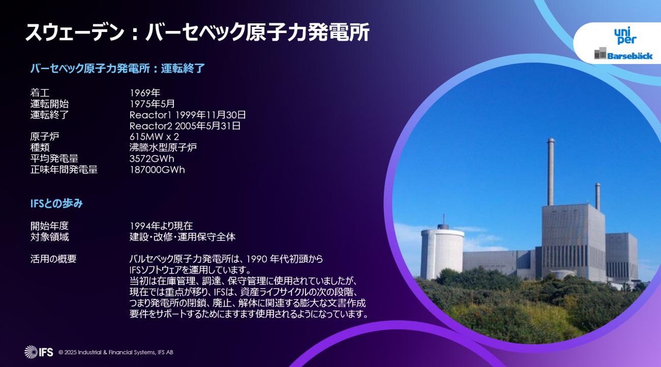 また、現在は運転が終了しているスウェーデンのバーセベック原子力発電所では、1994年から30年以上にわたり、在庫管理・調達・保守管理にIFSが利用されてきた。そして現在は、発電所の廃炉・解体プロセス全体の文書管理をIFSのソリューションが担っている。