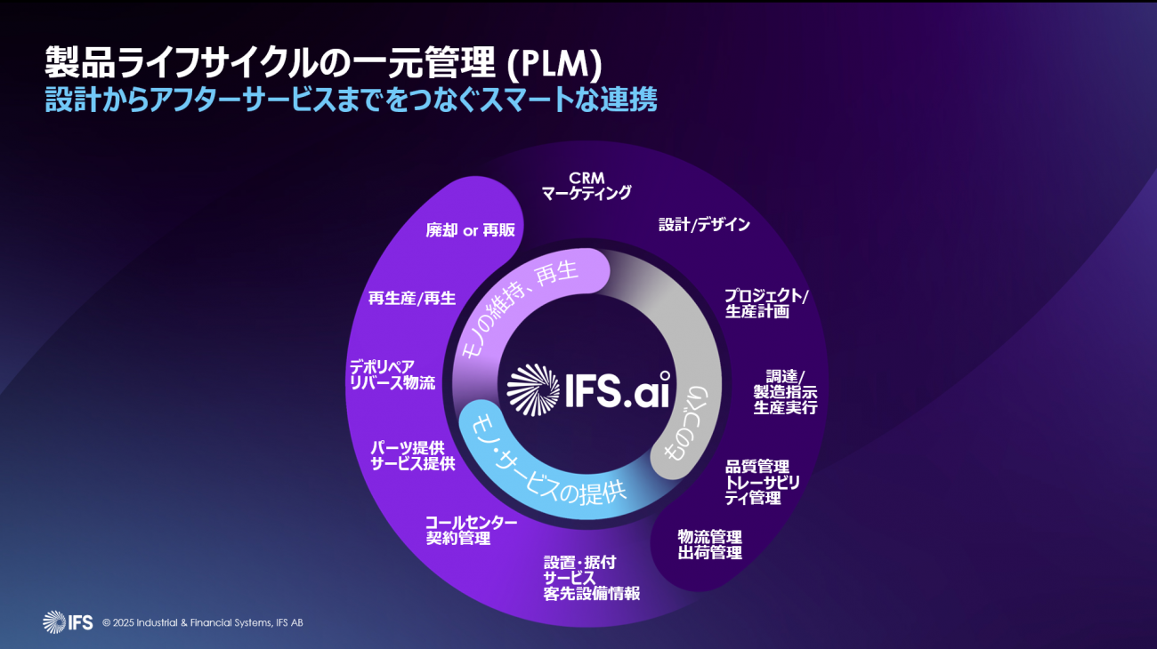 これらの事例で注目すべきは、IFSがPLM(製品ライフサイクル管理)を設計から廃棄まで一気通貫で管理できるプラットフォームだという点だ。竹中氏は、「1つのプラットフォーム上で設計から廃棄までを一元管理できるソリューションを有しているのは、唯一我々だけではないか」と自信を見せる。