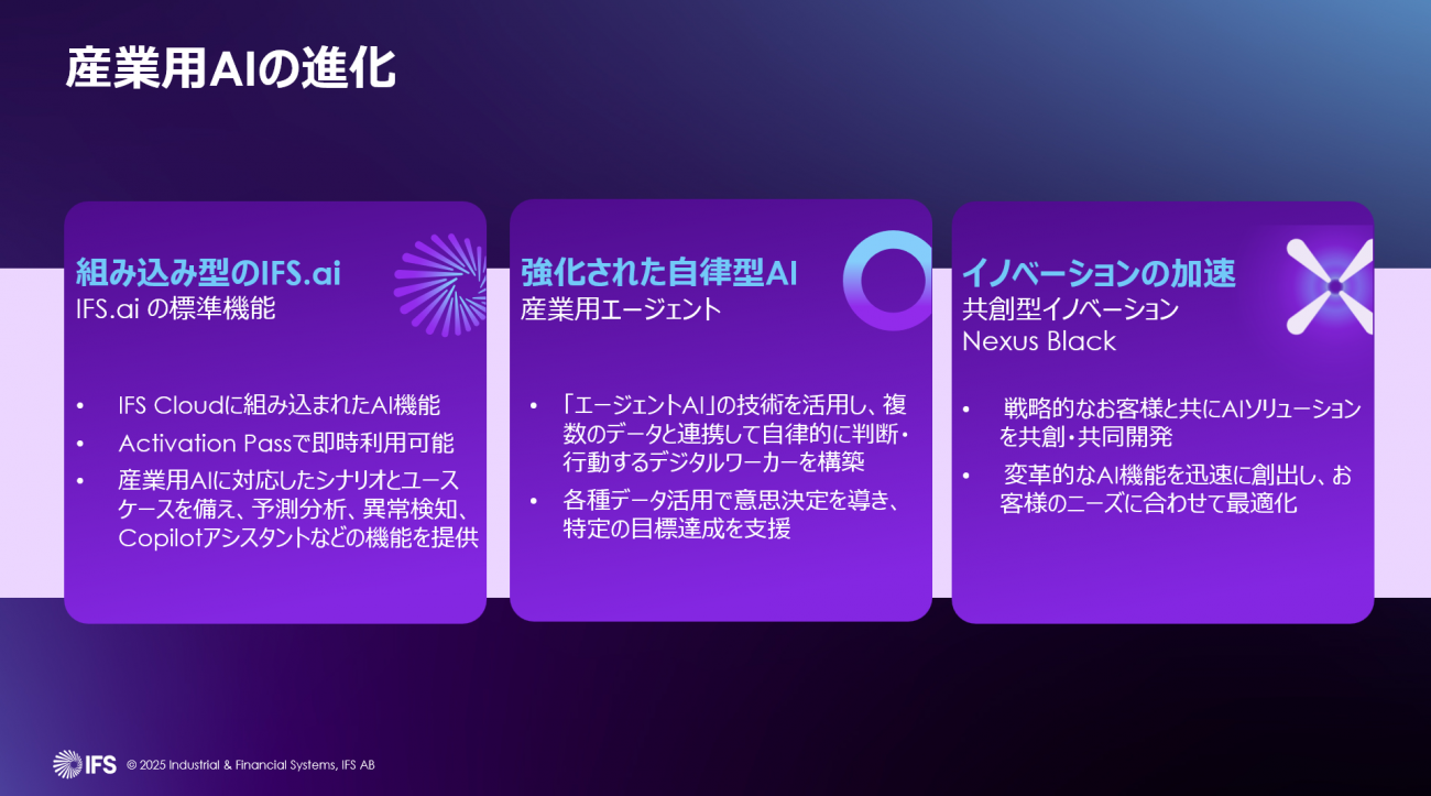 この課題に応えるべく、IFSは多様なAI展開のアプローチを採用している。たとえば前述のとおり、IFS Cloudに標準搭載された組み込み型AIを即座に利用開始してみることも可能だ。あるいは、タスクベース/ロールベースに設計された産業用エージェントの自律型AI「デジタルワーカー」を利用して、現場業務を変革することもできる(これについては後ほど詳しく解説する)。さらには、顧客と共にAI活用の新たなユースケースを開発する「Nexus Black」という共創サービスもある。これにより、さらなるAI活用の場面を発見・開拓することも可能だ。