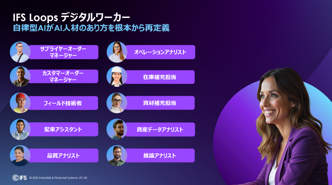 IFS Cloudは2025年度の時点で、約150種類の業務とスキルに対応できる自律型のデジタルワーカーを実装済みだ。現時点でデジタルワーカーが企業に提供するのは、以下6つの価値である。