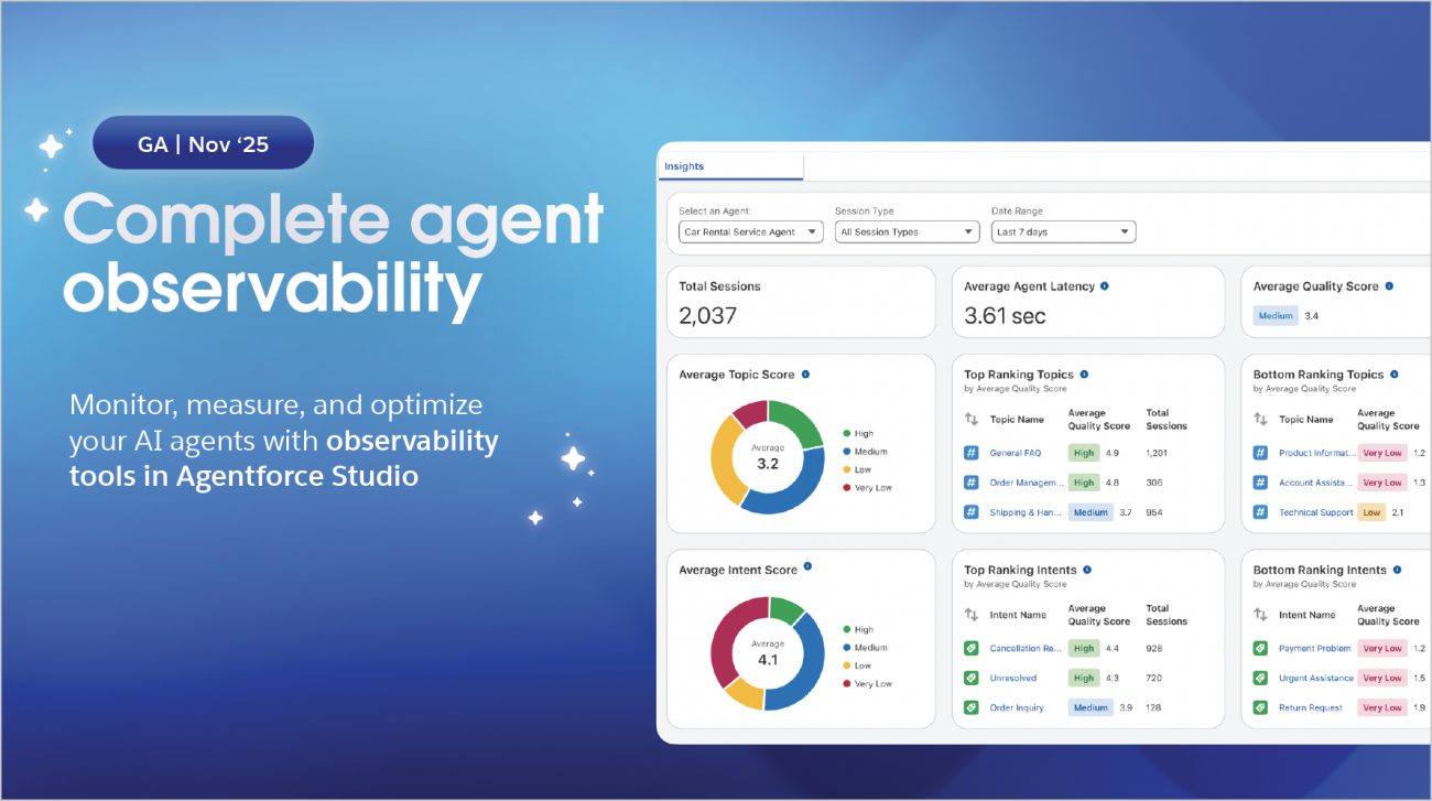 そこで、複雑になるマネジメントの負荷を軽減するため、提供される新しいツールが「Agentforce Observability」である。これはAIエージェントのパフォーマンス最適化のためのコントロールセンターであり、ニアリアルタイムでの監視からインサイトの提供、問題の発見、迅速な解決までを支援してくれる。ユーザーは、エスカレーション率や顧客満足度のように、人間の担当者が業務で用いる各種指標に加えて、全セッション数や平均レイテンシー、平均品質スコア、平均トピックスコアなど、AIエージェントのパフォーマンスで重点的に評価するべき指標もあわせて確認可能だ。