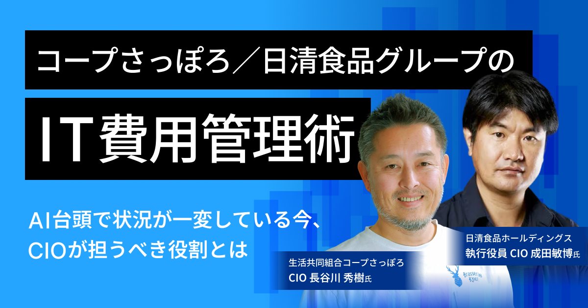 DXを推進してきた企業が、IT環境整備などの次に直面する課題として「IT費用管理」がある。クラウドやSaaSの利用が前提となり、AI活用も本格化。コストの発生源が複雑化し、ブラックボックス化のリスクが高まっている。DX先進企業は、どのようにIT費用管理に向き合っているのか。DIGGLEでCCSOを務める畠山遼氏が、コープさっぽろ CIOの長谷川秀樹氏と、日清食品ホールディングス CIOの成田敏博氏をゲストに迎え、これからのIT費用管理について聞いた。