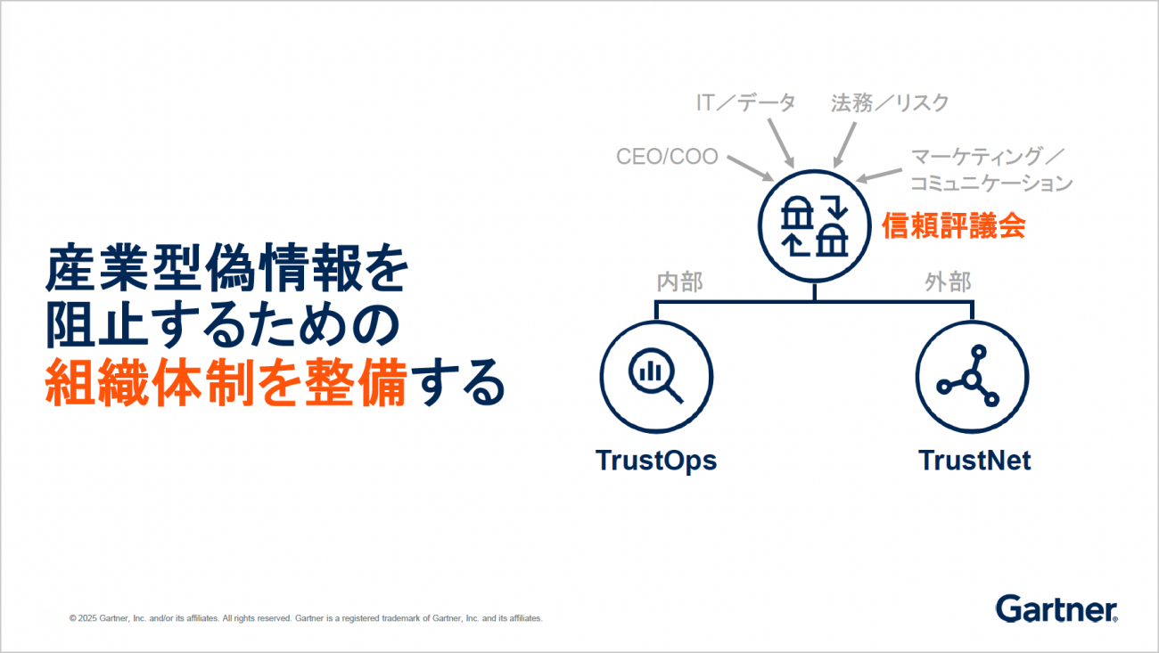 TrustOpsとは、企業におけるガバナンスの構築、そして偽情報への対処に必要なあらゆるものの整備を意味する。その構築に向けて、最初の基礎固めとなるのが前述した関係部門から専門知識を持ったメンバーを集め、組織横断の信頼評議会を設置することだ。この評議会では、偽情報に関するあらゆる問題を検討し、ルールの整備やテクノロジーの選定などを行う。